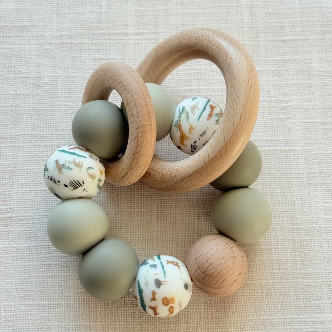 Deze bijtring print is een echte must have voor baby’s. Deze handgemaakte bijtring is gemaakt van zachte siliconen kralen in combinatie met 2 houten ringen die een rustgevend rammelend geluid maken. Fijn om mee te spelen en verzachtend bij doorkomende tandjes.