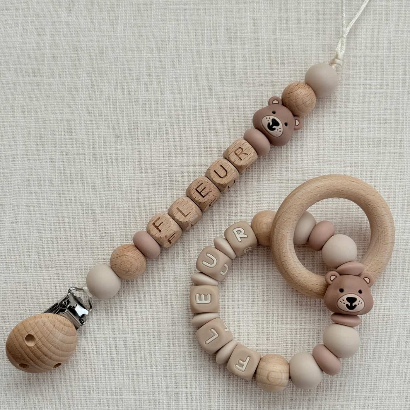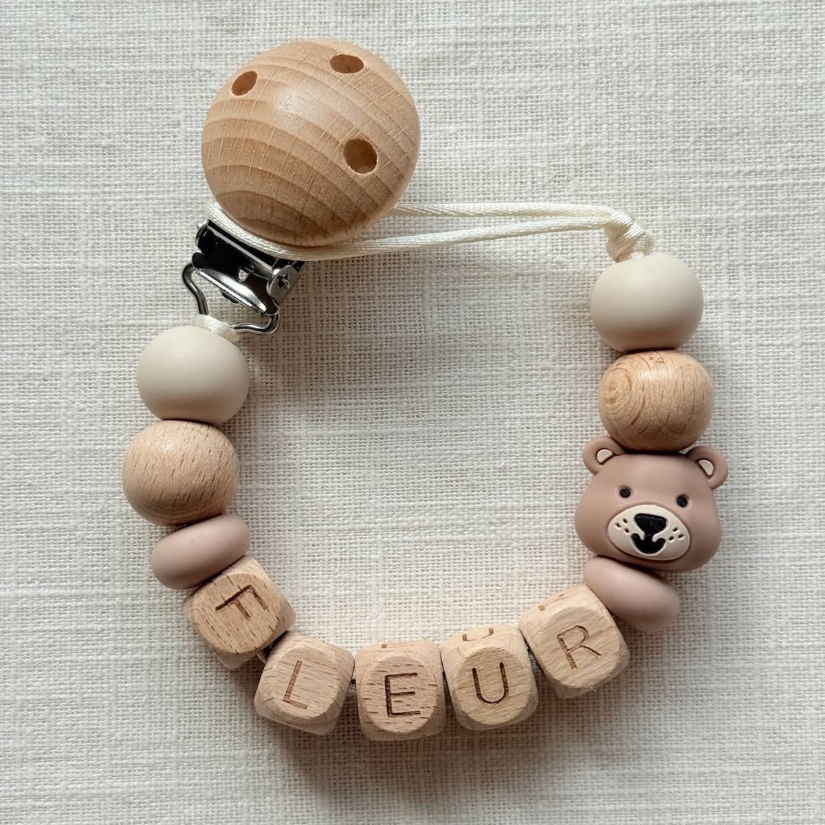 Het Speenkoord met naam beertje naturel is een tijdloze must-have voor elke ouder. De neutrale kleuren passen met gemak bij elke stijl, terwijl het lieve beertje zorgt voor een unieke en speelse uitstraling. Het speenkoord voorkomt dat de speen op de grond valt en is handig thuis, onderweg of in de kinderwagen.